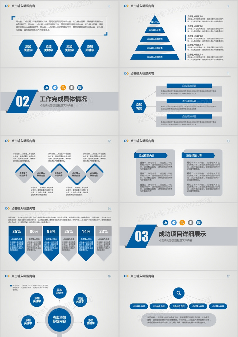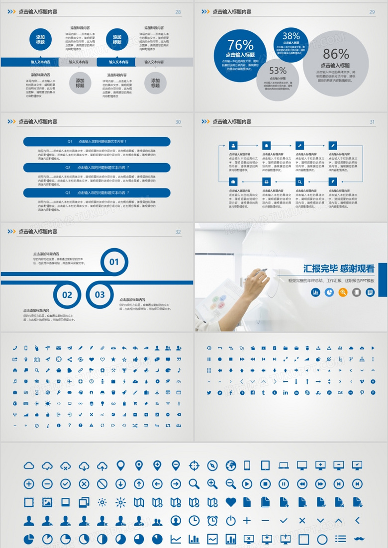 本作品内容为2021简约蓝色商务通用述职报告工作总结PPT模板, 格式为 pptx, 大小5 MB, 页数为38,比例16:9, 请使用软件PowerPoint(2010)打开, 作品中主体文字及图片可替换修改,文字修改可直接点击文本框进行编辑,图片更改可选中图片后单击鼠标右键选择更换图片,也可根据自身需求增加和删除作品中的内容, 源文件无水印