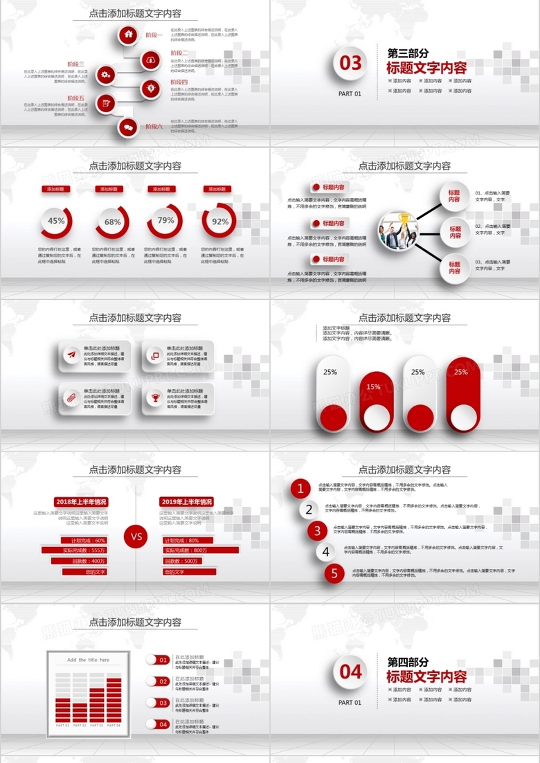 本作品内容为2021红色新年工作总结和2022年计划汇报PPT模板, 格式为 pptx, 大小8 MB, 页数为34,比例16:9, 请使用软件PowerPoint(2010)打开, 作品中主体文字及图片可替换修改,文字修改可直接点击文本框进行编辑,图片更改可选中图片后单击鼠标右键选择更换图片,也可根据自身需求增加和删除作品中的内容, 源文件无水印