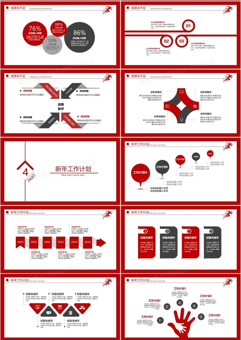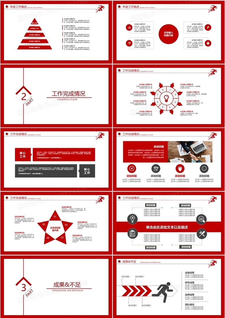 本作品内容为奔跑吧2022红色简约风年终工作总结暨新年计划PPT模板, 格式为 pptx, 大小11 MB, 页数为28,比例16:9, 请使用软件PowerPoint(2016)打开, 作品中主体文字及图片可替换修改,文字修改可直接点击文本框进行编辑,图片更改可选中图片后单击鼠标右键选择更换图片,也可根据自身需求增加和删除作品中的内容, 源文件无水印