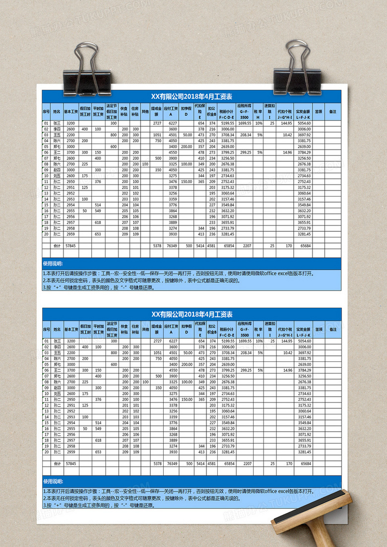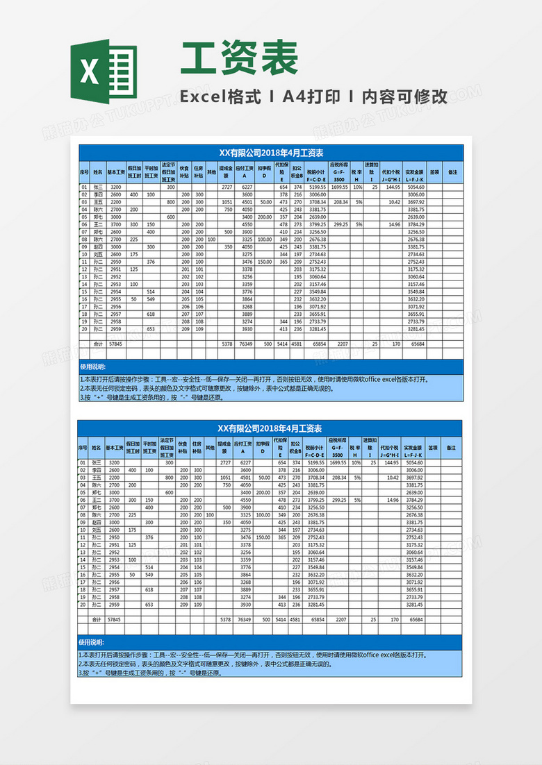 本作品内容为工资表管理自动计算和扣税自动生成工资条模板, 格式为 xlsx, 大小1 MB, 请使用软件Excel(2016)打开, 作品中主体文字及图片可替换修改,文字修改可直接点击文本框进行编辑,图片更改可选中图片后单击鼠标右键选择更换图片,也可根据自身需求增加和删除作品中的内容, 源文件无水印