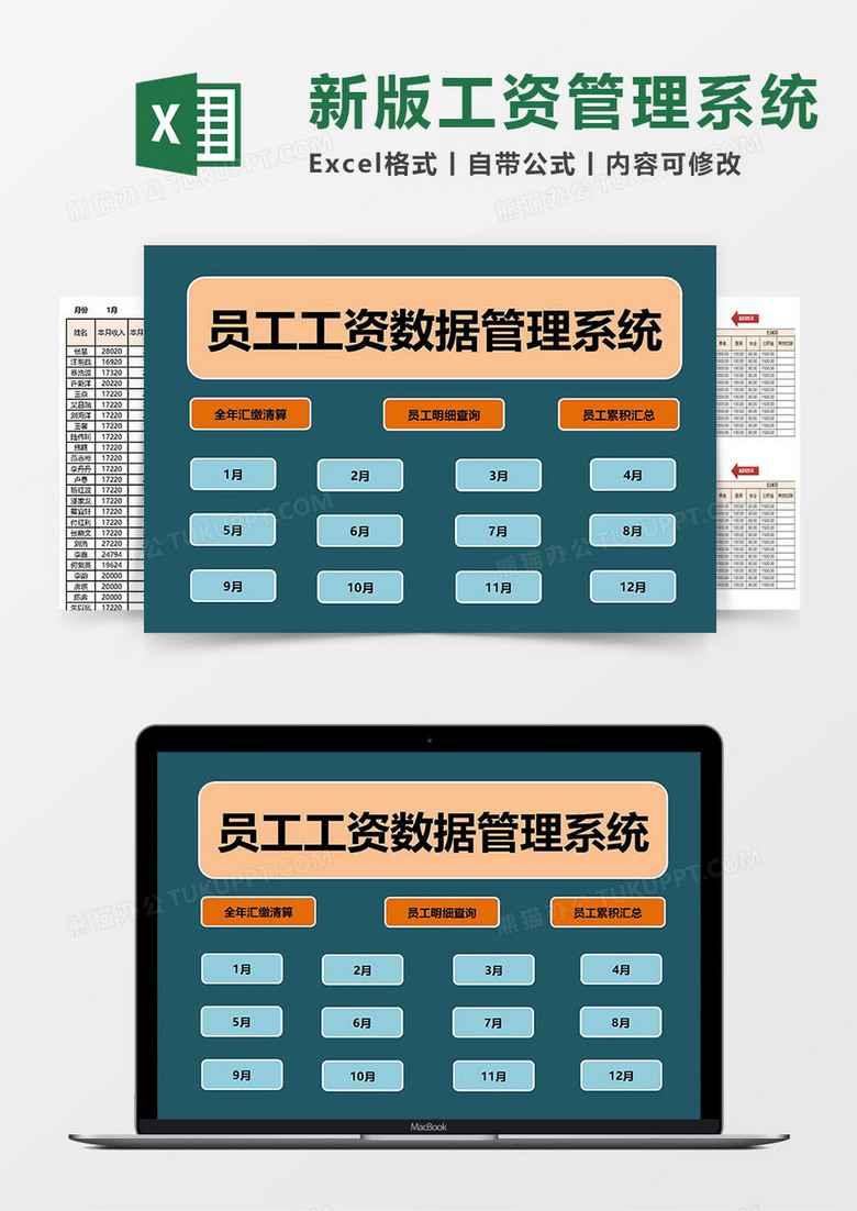 本作品内容为超实用员工全年工资数据Excel管理系统, 格式为 xls, 大小1 MB, 请使用软件Excel(2003)打开, 作品中主体文字及图片可替换修改,文字修改可直接点击文本框进行编辑,图片更改可选中图片后单击鼠标右键选择更换图片,也可根据自身需求增加和删除作品中的内容, 源文件无水印